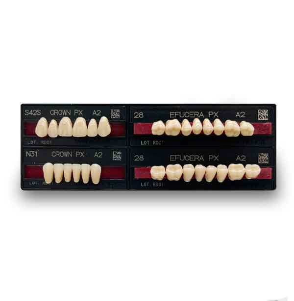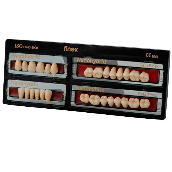 - جنس و ساختار: دندانهای فینکس از رزین نانوهایبرید با ترکیبات کوپلیمرها و رزینهای کامپوزیتی ساخته شدهاند که مقاومت و دوام بالایی را فراهم میکنند.