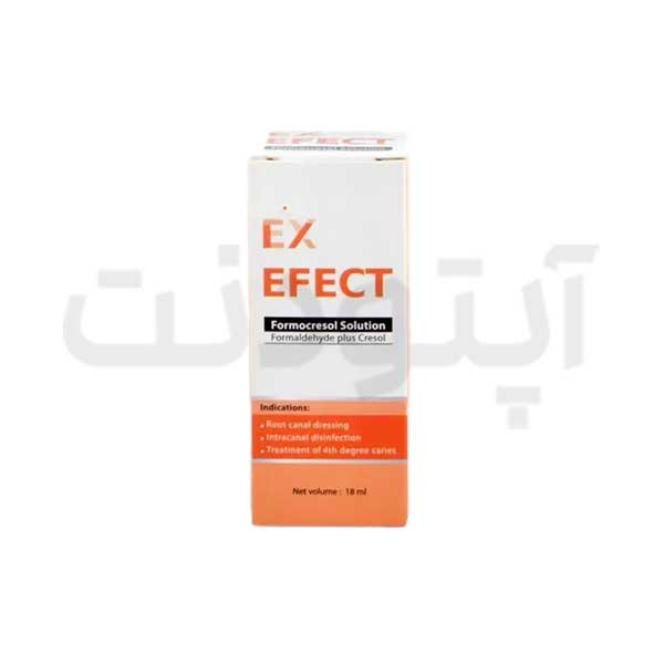 EX EFECT یک نوع محلول ضدعفونی قوی مشتمل بر اجزاء فعال کرزول و فرمالین می باشد. این محصول دارای خاصیت ضدباکتری و ضدمیکروبی بسیار مؤثر بدون هرگونه احساس سوزش و تحریک بافت است که در هنگام عصب کشی و درمان ریشه مورد استفاده قرار می گیرد.